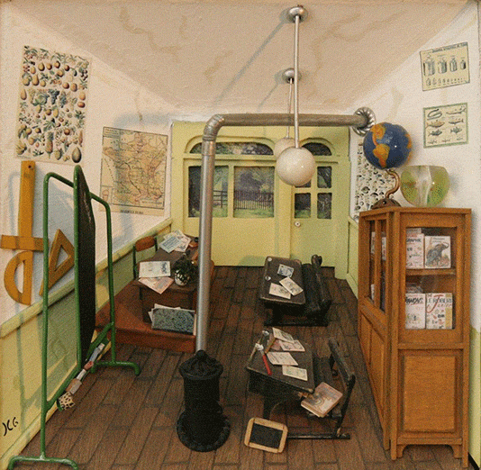 Redonner réalité au réelLe côtoiement quotidien des lieux et des choses tend à nous les faire perdre de vue. Ils sont bien là, certes, mais banalisés par la routine de leur présence, déréalisés en quelque sorte, ayant perdu l’aspect insolite qu’a en soi, en tout cas que devrait avoir en soi, toute existence. Une composante essentielle de toute démarche artistique est de se donner pour mission de rendre consistance à ce qui est devenu évanescent. Retrouver vivacité à l’encontre de cet émoussement. De nombreuses techniques peuvent y participer. L’une d’elles est le changement d’échelle, en particulier la miniaturisation. Bouleversant le regard blasé auquel nous nous étions laissé aller, ce changement de rapport de grandeur entre nous et le monde nous force à reconsidérer ce qui nous entoure et, par là même, à ressaisir notre propre situation en son sein. En littérature, Swift en avait fait en son temps une brillante démonstration avec le personnage de Gulliver. Mino Grazioli, quant à lui, réalise des tableaux miniatures en trois dimensions, des lieux banals comportant généralement les objets les plus communs, nous forçant à les revoir vraiment, sous une réalité en quelque sorte plus intense. Les fausses perspectivesSuite à sa rencontre en 1979 avec le peintre australien Fred Jessup, qui jouera un grand rôle dans l’impulsion de sa démarche, il découvre les fausses perspectives des enluminures et bas-reliefs pratiquées par les moines du XIe au XVe siècle. Si le principe général de la diminution de la grandeur des objets des premiers plans aux derniers plans y est respecté, le point de fuite par contre n’est pas unique, comme il devrait l’être dans un strict dessin géométrique. Cette multiplication des directions, qui peut sembler disloquer la cohérence de la représentation, permet d’y présenter la même scène sous différents angles, et l’enrichit de la multiplicité d’une présence plus réelle. Mais en deux dimensions, les points de fuite restent sur la même surface. Le passage en trois dimensions rend cette technique plus complexe, les points de fuite se situant alors en arrière dans l’espace, en dehors de la représentation. Aussi l’artiste s’intéressera-t-il ultérieurement au cinéma des années 1940 et 1950, dont les décors utilisent fréquemment cette technique de la fausse perspective. |