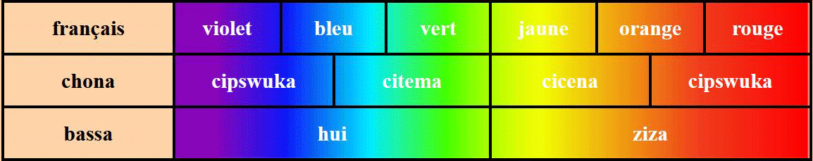 Limitons-nous ici à ce qu’on appelle les couleurs élémentaires, les problèmes posés ne dépendant pas de la finesse de la dénomination. Prenons trois langues différentes, appartenant à trois familles différentes, ceci pour mettre en évidence les très grandes différences qu’on peut constater. La source est l'Introduction à la linguistique du linguiste américain Henry Allan Gleason (1917–2007). Le chona (ou shona) est parlé en Zambie, pays d'Afrique centrale, proche du Kalahari, de 750 000 km2. Pour comparaison, la France en fait 550 000. Le bassa est parlé au Libéria, pays d'Afrique occidentale de 111 400 km2. Notons qu'il s'agit de langues parlées par des millions de personnes.